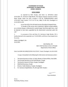 ਪੰਜਾਬ ‘ਚ ਮਾਨ ਸਰਕਾਰ ਨੇ ਭ੍ਰਿਸ਼ਟਾਚਾਰ ਦੇ ਦੋਸ਼ ‘ਚ ਗ੍ਰਿਫ਼ਤਾਰ ਹੋਏ ਸੀਨੀਅਰ IPS ਅਫ਼ਸਰ ਹਰਚਰਨ ਸਿੰਘ ਭੁੱਲਰ ਨੂੰ ਨੌਕਰੀ ਤੋਂ ਸਸਪੈਂਡ ਕਰ ਦਿੱਤਾ ਹੈ। ਦੱਸ ਦੇਈਏ ਕਿ ਪਿਛਲੇ ਦਿਨੀਂ ਉਨ੍ਹਾਂ ਨੂੰ ਕਥਿਤ ਤੌਰ ਤੇ ਰਿਸ਼ਵਤ ਦੇ ਦੋਸ਼ ‘ਚ ਸੀਬੀਆਈ ਵਲੋਂ ਗ੍ਰਿਫ਼ਤਾਰ ਕੀਤਾ ਗਿਆ ਸੀ ਜਿਸ ਤੋਂ ਬਾਅਦ ਉਨ੍ਹਾਂ ਦੇ ਕੋਲੋ 7.5 ਕਰੋੜ ਕੈਸ਼ ਤੇ ਕਰੋੜਾਂ ਦਾ ਸੋਨਾ ਮਿਲਿਆ ਸੀ ਜਿਸ ਦੀ ਜਾਂਚ ਚੱਲ ਰਹੀ ਹੈ।